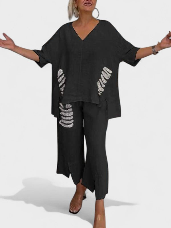 ✅Detalii cu paiete atrăgătoare: Accentele strălucitoare de pe top și pantaloni adaugă o notă jucăușă și la modă. Aceste ornamente subtile aduc un plus de glamour garderobei tale de zi cu zi. Este echilibrul perfect între casual și chic.