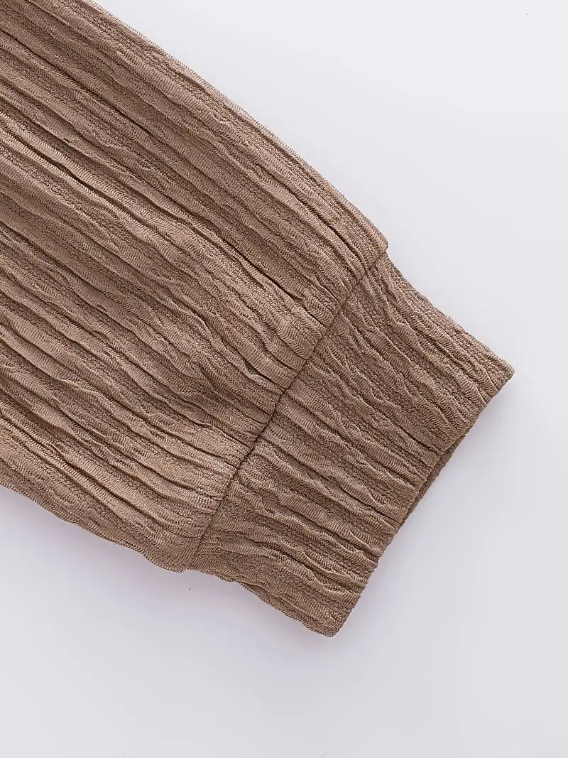 Croială relaxată și flatantă: Cu o talie elastică confortabilă și o croială relaxată, acest set flatează o gamă largă de siluete. Se drapează natural, fără a se lipi de corp, oferindu-ți încredere și lejeritate în fiecare mișcare. Este elegant, confortabil și flatant, toate într-un singur produs.